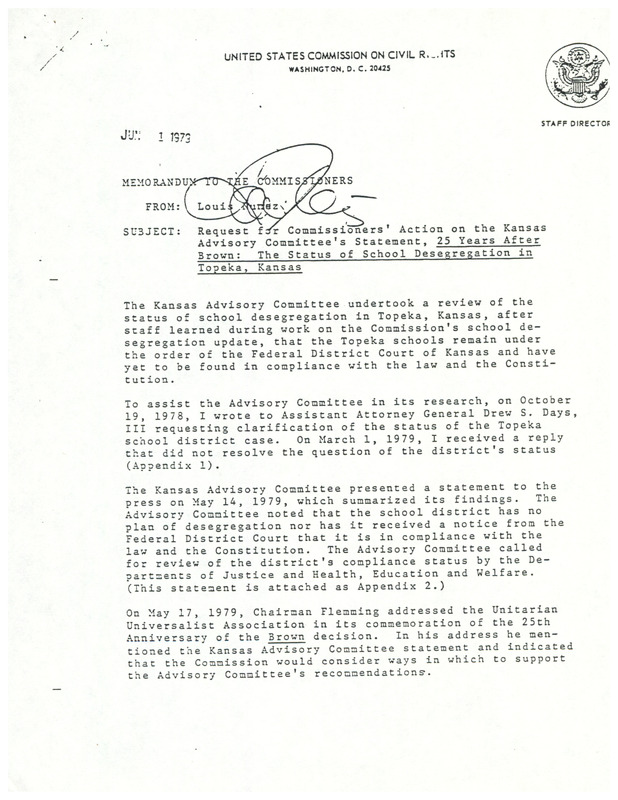 Louis Nunez of the United States Commission on Civil Rights issues a memo requesting commissioners of other federal agencies to take action on the Kansas Advisory Committee's statement. He requests that other commissioners write letters to the Department of Justice in favor of making the Topeka School District comply with desegregation orders.