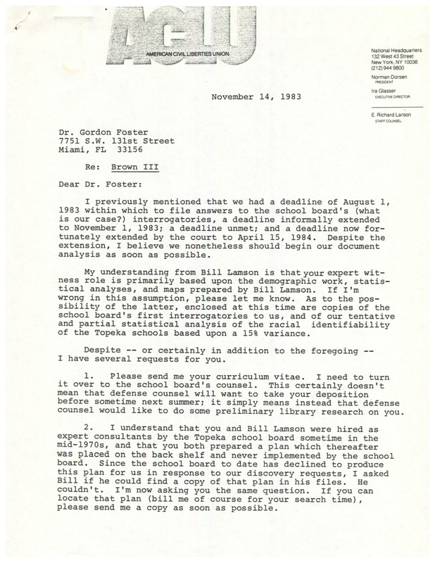 Case Data and Exhibits for Brown III, a relitigation of Brown v. Topeka Board of Education (1954) that corrected resegregation issues caused by open enrollment school choice in 1992. A letter from Richard Larson of the ACLU to Dr. Gordon Foster to inquire about his role as an expert witness in the Brown III case.