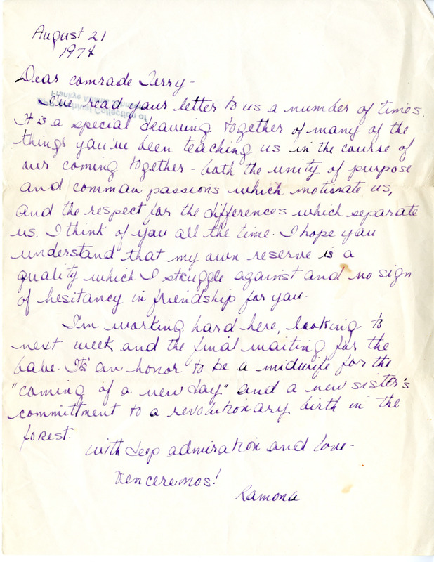 A letter from Ramona to Terry. She mentions the letters received and the great content of them. Romona writes about her reserve before mentioning that she has been chosen to be a midwife for an upcoming pregnancy happening in the forest. Lastly, she sends her love.