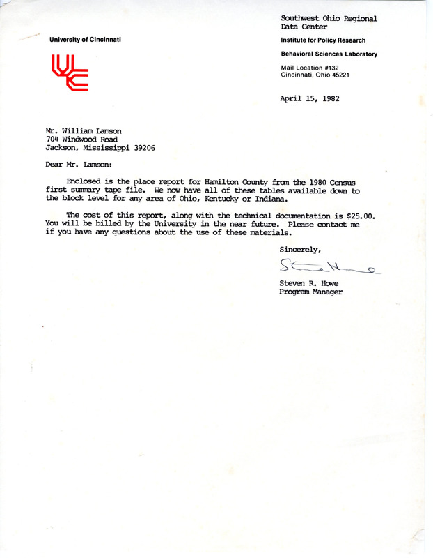 Steven R. Howe of the Southwest Ohio Regional Data Center at the University of Cincinnati writes to William Lamson to inform him that he has sent the place report for Hamilton County (Ohio) from the 1980 Census first summary file tape. Howe writes that they have census data available down to the block level for any area of Ohio, Kentucky or Indiana.
