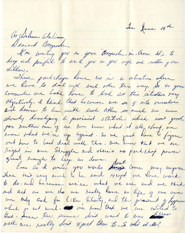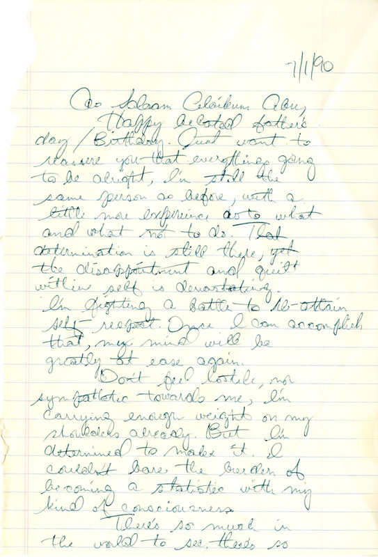 A letter from Nuh Abdul Qaiyum, who is imprisoned, to his wife Frankye Adams-Johnson (Malika). He writes about love: as a family, in marriage, and how the oppressors affect their relationships. He writes that the oppressors will not win, blessings will come, and their relationship will stay strong. The letter is dated “Thursday.”