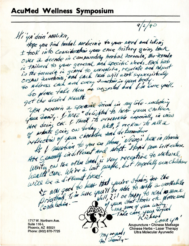 Richard, a natural healer and herbal medicine specialist, writes Frankye Adams-Johnson (Malika) regarding the herbal remedies and medicine that she received. He also addresses their strong relationship and the future of the movement from his viewpoint.