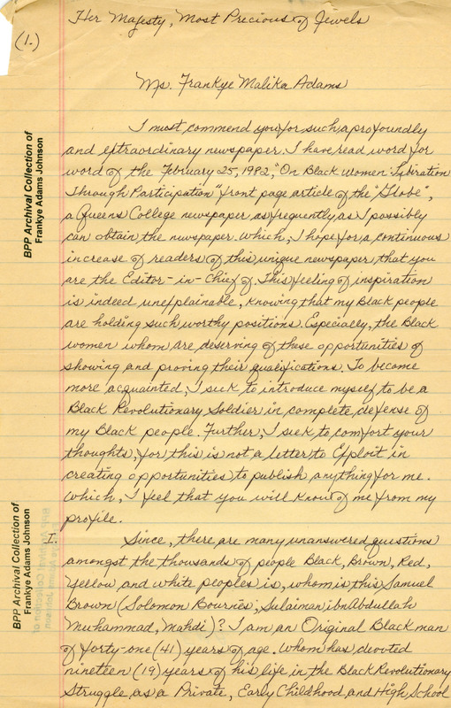 A letter from Nuh Abdul Qaiyum, who is imprisoned, to his wife Frankye Adams-Johnson (Malika). He explains how his imprisonment has helped him gain knowledge on slavery and the reality of Black women in America. He mentions a project he's been working on with the other imprisoned Black Panther Party members. Letter is dated ”Thursday 28th, 1976.”