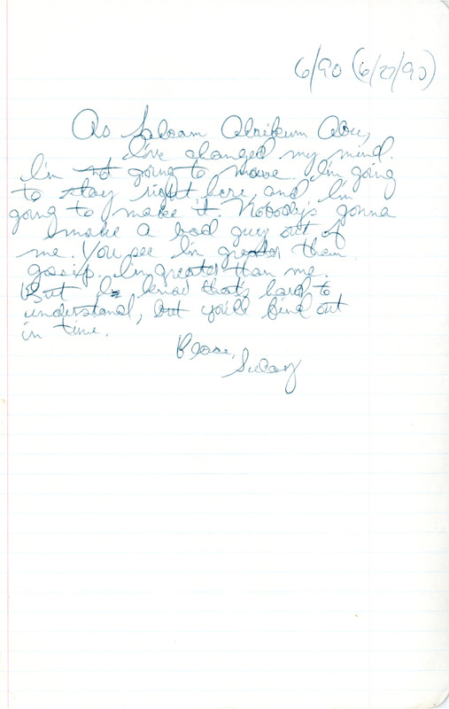 A letter from Nuh Abdul Qaiyum, who was sentenced to prison in 1975 for a 1971 Black Liberation Army (BLA) connected shooting of police officers in New York, to his wife Frankye Adams-Johnson (Malika). He writes a love poem to his wife. He also includes a money order. The letter is dated “Saturday afternoon.”