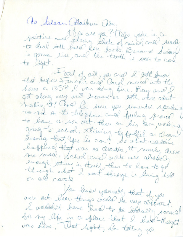 In this letter, Frankye Adams-Johnson (Malika)’s husband, Nuh Abdul Qaiyum, who is imprisoned, praises her skills as a mother. He focuses on Black Panther Party business and actions that need to be taken regarding members. He thanks her for a poem he received and informs her that he is close to completing his degree.