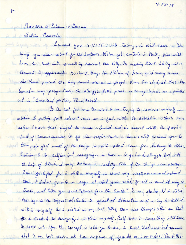 In this letter, Frankye Adams-Johnson (Malika)’s husband, Nuh Abdul Qaiyum, who is imprisoned, updates her on his prison privileges and tells her to expect a call regarding her probation and visitation rights. He mentions he has a birthday gift to be delivered, and informs her on the legal battles of other members and their needs of communication.