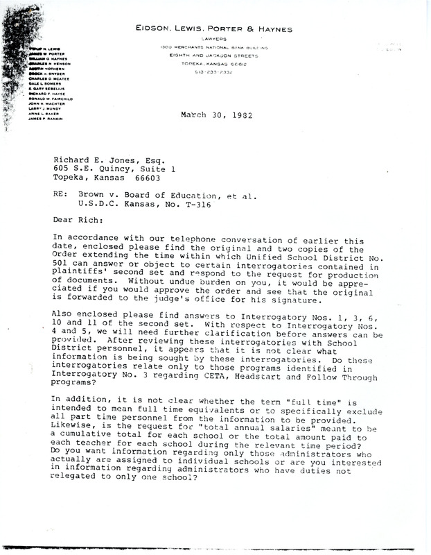 Lead Defense Attorney K. Gary Sebelius writes to Attorney Richard E. Jones. Mr. Sebelius is seeking clarification on a number of interrogatories and responses submitted by the plaintiff team. Specifically, there are questions on the meanings of some terms (“full time,” for example) and questions about cumulative vs. individual teacher salaries.