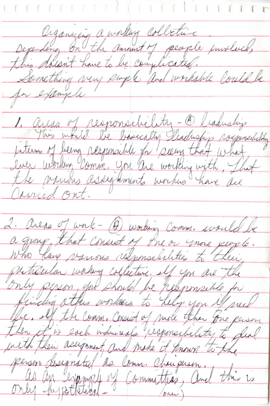 A letter from Nuh Abdul Qaiyum, who is imprisoned, to an unknown recipient. He gives an outline on how to organize the Black Panther Party members into organized units and working committees, based on the purpose the members serve, how these committees should interact with one another, and how leadership can create comradery in the members.