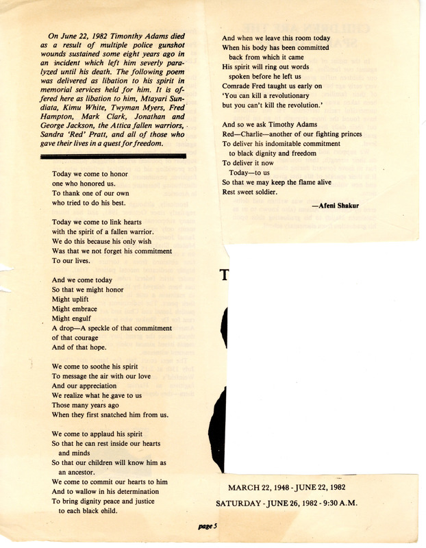 A poem written by former Black Panther Party Member Afeni Shakur after the death of Timothy Adams on June 22, 1982. His death came from complications from gunshot wounds he suffered 8 years prior at the hands of the police that left him paralyzed. The poem is offered as libation to him and several others who gave their lives for freedom.