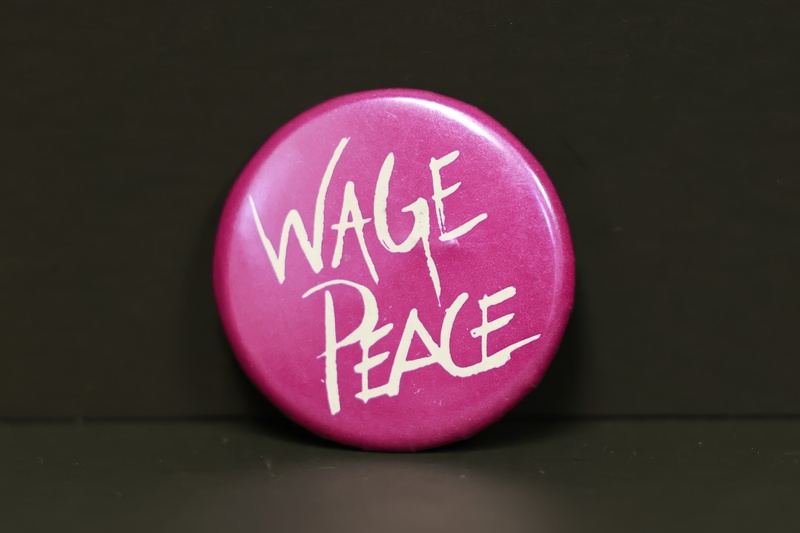 A purple button with text that says "Wage Peace." The phrase was popularized in a speech given by President Dwight D. Eisenhower in 1953 during the Cold War. “Wage Peace” went on to be a rally cry for the anti-war and peace movements, especially during the Vietnam War.