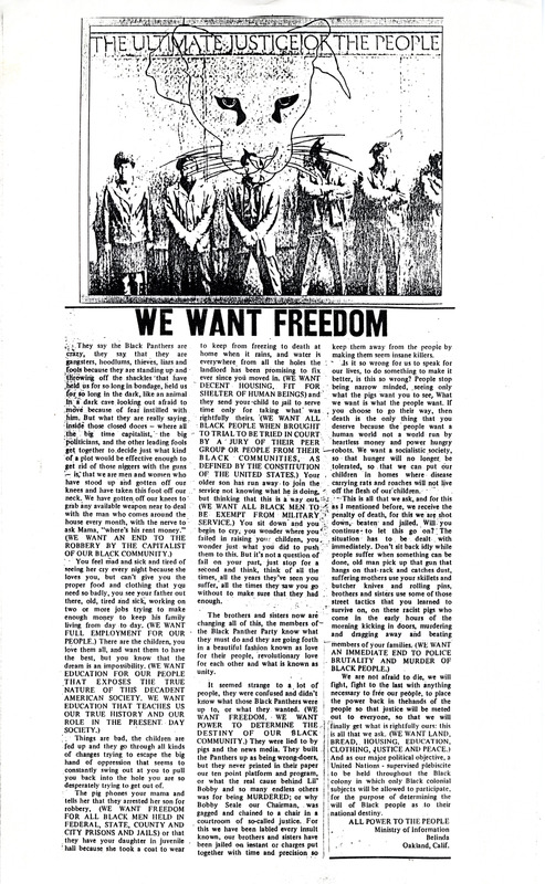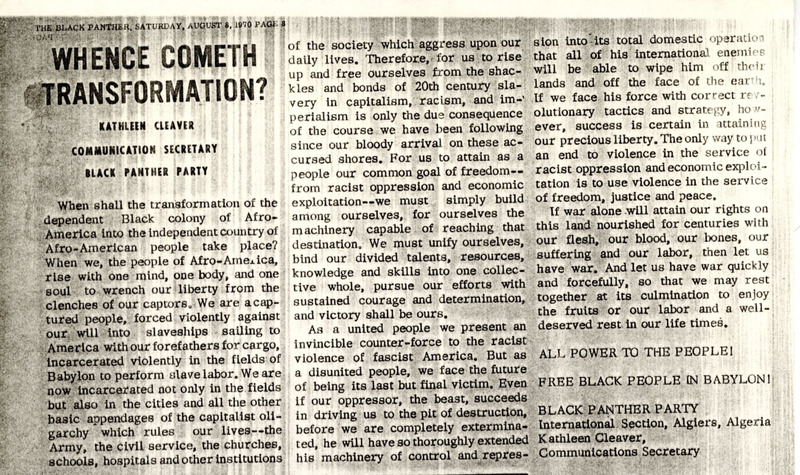 A newspaper article from The Black Panther. Communications Secretary Kathleen Cleaver argues that unity amongst Black people is necessary to fight oppression and that the use of violence in the service of freedom, justice, and peace is the only way to put an end to the violence of racism against “the Black colony of Afro-America.”