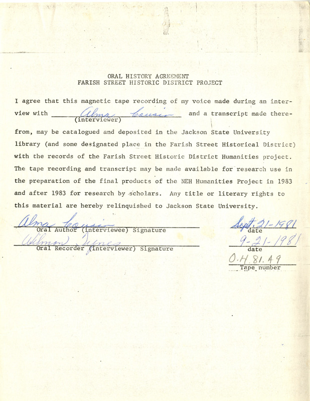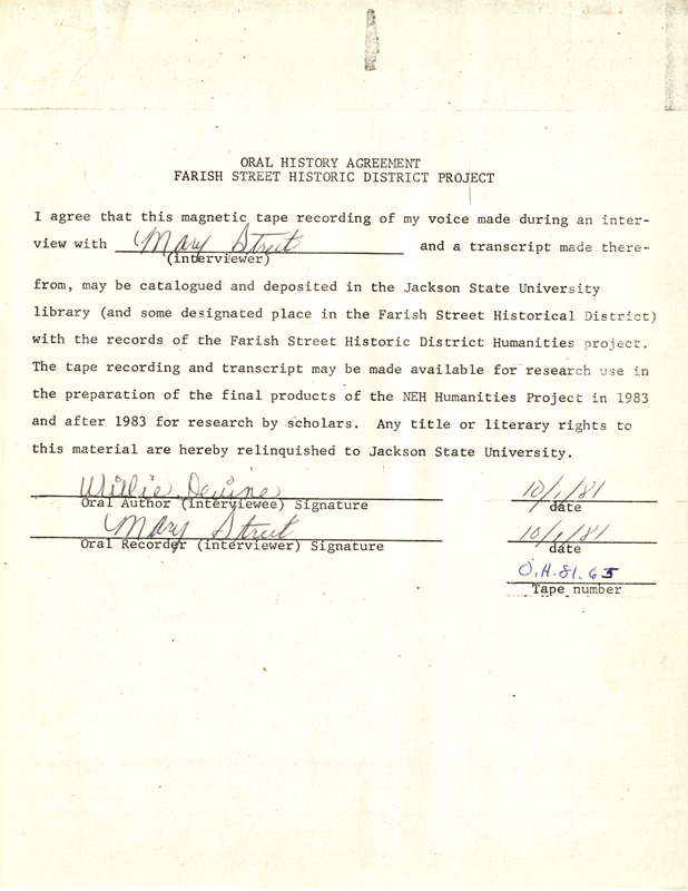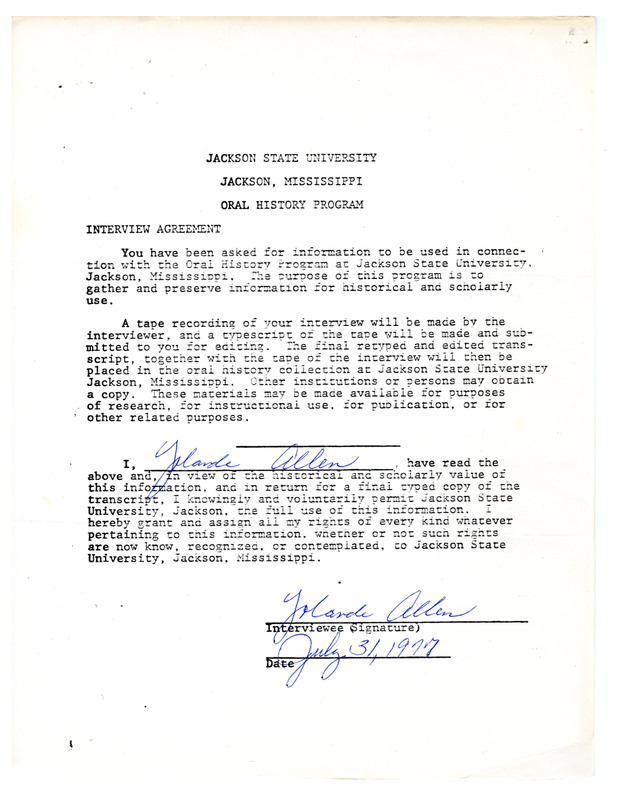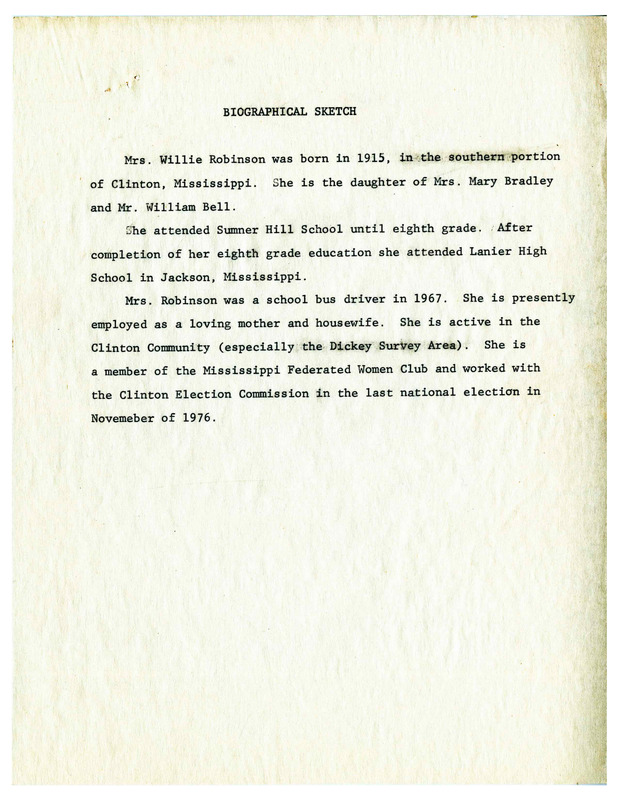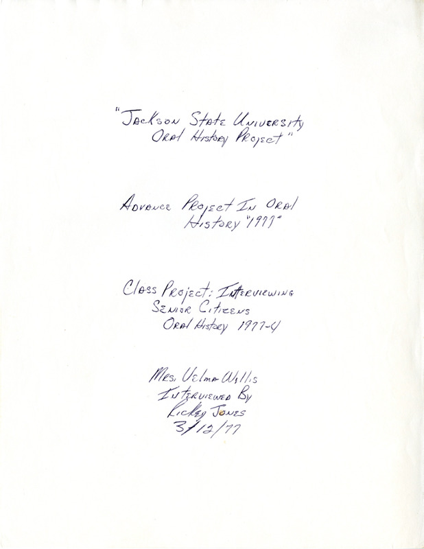 Velma Willis was born in Newton County, Mississippi in 1903 and moved to Jackson in 1943. Ms. Willis talks about starting school in 1911 and finishing 8th grade and becoming a certified teacher for the next 35 years. She talks about her views on race relations in Newton County, one of the counties she taught in. Transcript is hand written.