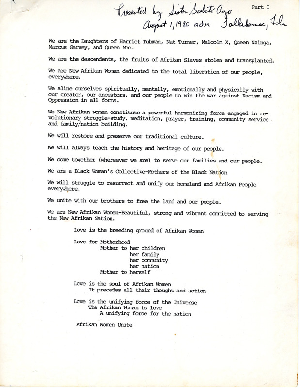 A speech about the role of Black women in the Republic of New Afrika. Sister Ayo writes that New Afrikan women are dedicated to the total liberation of their people and will also teach the history and heritage of their children to prepare them for self rule. The Republic of New Afrika was founded in 1968 and popularized by black militant groups.