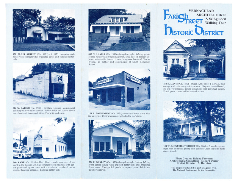 A brochure for a walking tour of the Farish Street Historic District, containing a tour map and pictures of significant homes, churches, nightclubs, and other buildings in the District.