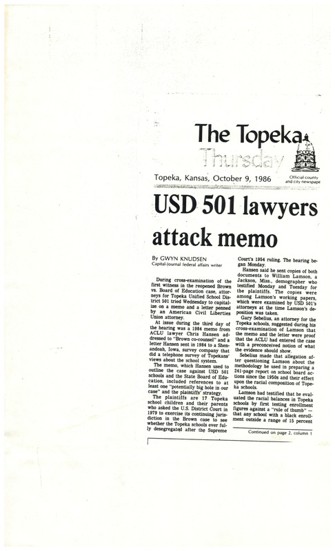 A newspaper article from The Topeka Capital Journal about defense lawyers in the Topeka Public Schools desegregation case arguing that a memo from the ACLU shows that the organization had preconceived notions about what the evidence should show.