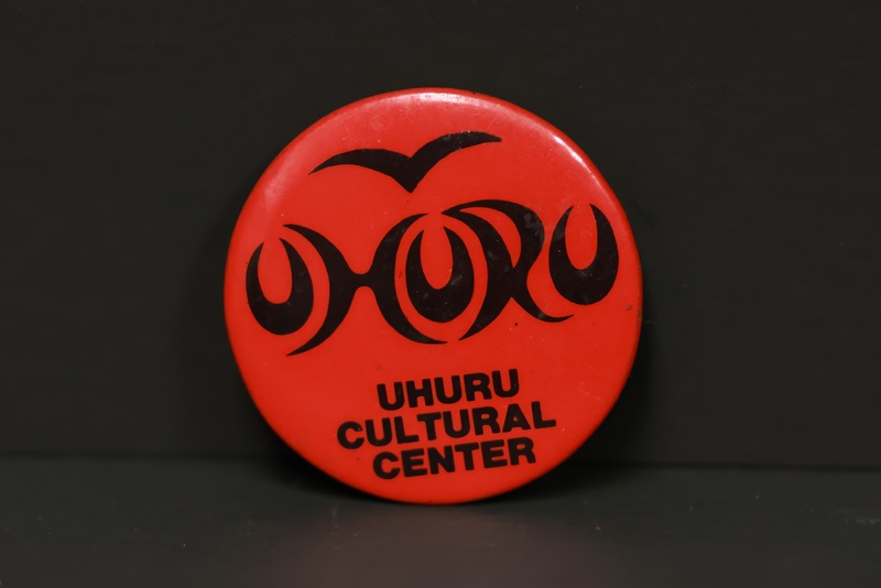 A red button with the logo for the Uhuru Cultural Center. The Uhuru Movement (from the Swahili word for "Freedom”) is an African Internationalist movement founded in 1972 by the African People's Socialist Party (APSP). Uhuru cultural centers and art centers were established around the country.
