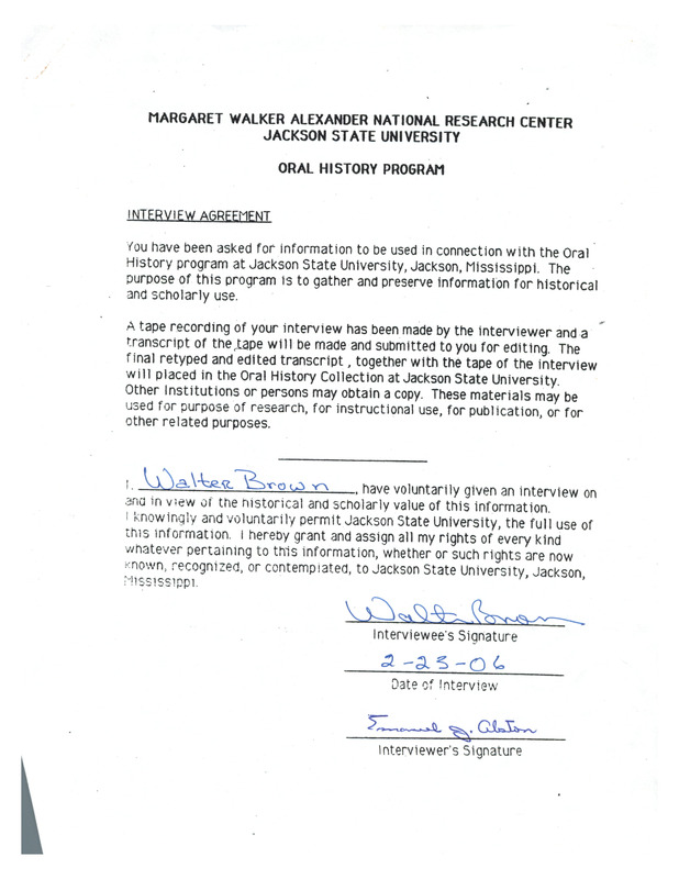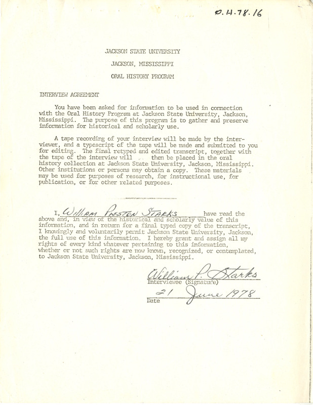 William Preston was born in Jackson in 1921 and worked as a mail carrier for the City of Jackson. In the interview, Mr. Preston talks about the food culture in the Farish Street District, including the Big Apple Inn, Big John's, and other restaurants located in the district. The transcript is heavily edited with handwritten notes.