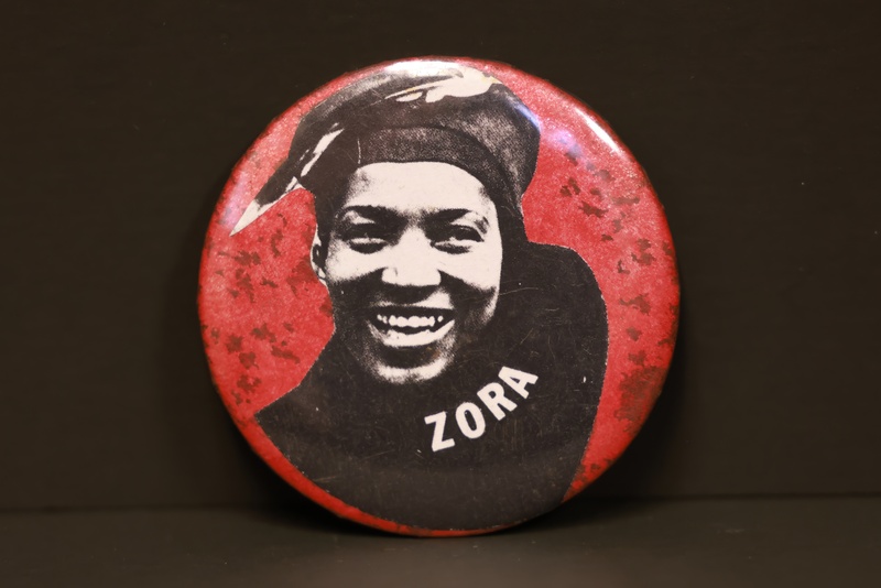 A multi-colored button with a photo of Zora Neale Hurston. The text reads “Zora.” Zora Neale Hurston was an author, filmmaker, and researcher, with a focus on African American and Caribbean folklore. Her most famous novel is “Their Eyes Were Watching God” and she wrote over 50 other works, including novels, short stories, plays, and essays.