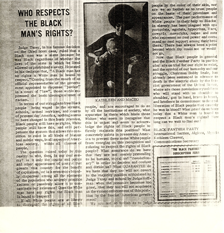 A newspaper article from The Black Panther. Communications Secretary Kathleen Cleaver ponders the idea of Black people's rights and how White people react to them. She wonders if revolutionary Whites are just pretending to be revolutionary as a way to divide Black people.