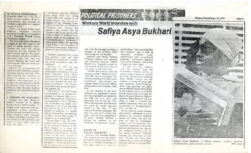 A newspaper article from Workers World. The writer interviews Safiya Asya Bukhari about her work in the community and with the Black Panthers and how that work brought police attention to her. At the time she was imprisoned at the Virginia Correctional Center for Women after being convicted in 1975 on weapons, murder, and robbery charges.