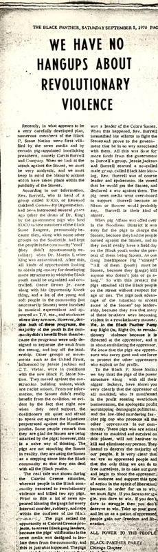 A newspaper article from The Black Panther by Moak Teba of the Chicago Black Panther Party. The article describes acts of violence against the people in Chicago and argues for taking that same violence to the oppressors. The story centers on the Panthers’ support of the Black P. Stone Nation, one of Chicago’s most notorious street gangs.