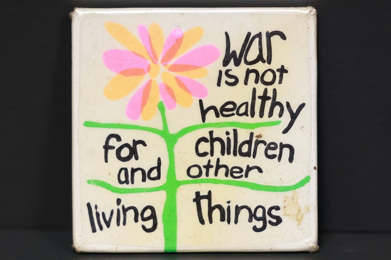 A white square button with a drawing of a flower. The text says: "War is not healthy for children and other living things." The button uses the poster design created by Chicago, Illinois, artist Lorraine Schneider in 1966. The design and slogan became an enduring symbol of the peace movement starting in 1967 with the Vietnam War.