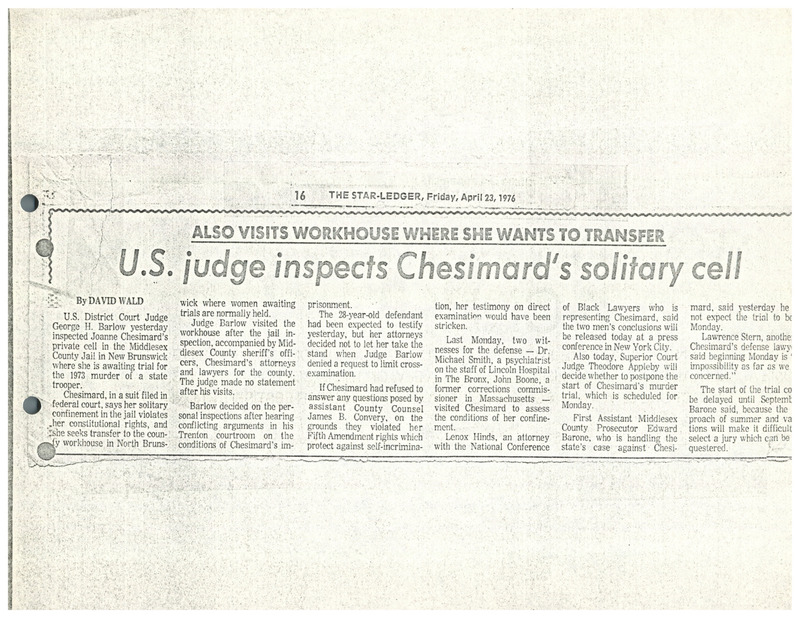 A newspaper article from The Star Ledger about District Court Judge George H. Barlow inspecting the cell where Assata Shakur (JoAnne Chesimard) is being held in Middlesex County to stand trial for the May 1973 killing of a state trooper. Shakur was convicted in 1977 of the killing and escaped prison in 1979.