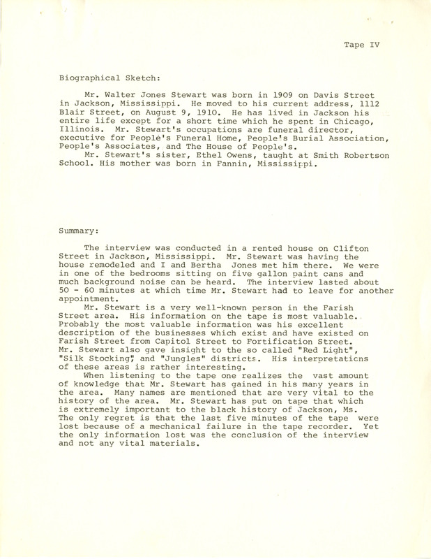 Walter Stewart lived his entire life in the Farish Street District from 1910 and was the funeral director at People's Funeral Home in the district. He talks about the changes the area has gone through over the years and recounts several stories about people and places in the area. The transcript is edited with handwritten notes.