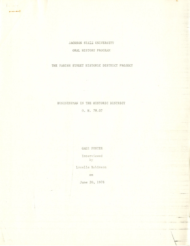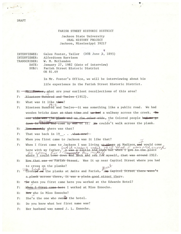 Gale Foster talks about his oldest memories of visiting the Farish Street District, dating back to 1912 when Farish Street was a dirt road. Mr. Foster went on to own a tailor shop on Farish Street and he discusses his history as a tailor and his life as a business owner. The transcript is heavily edited with handwritten notes.