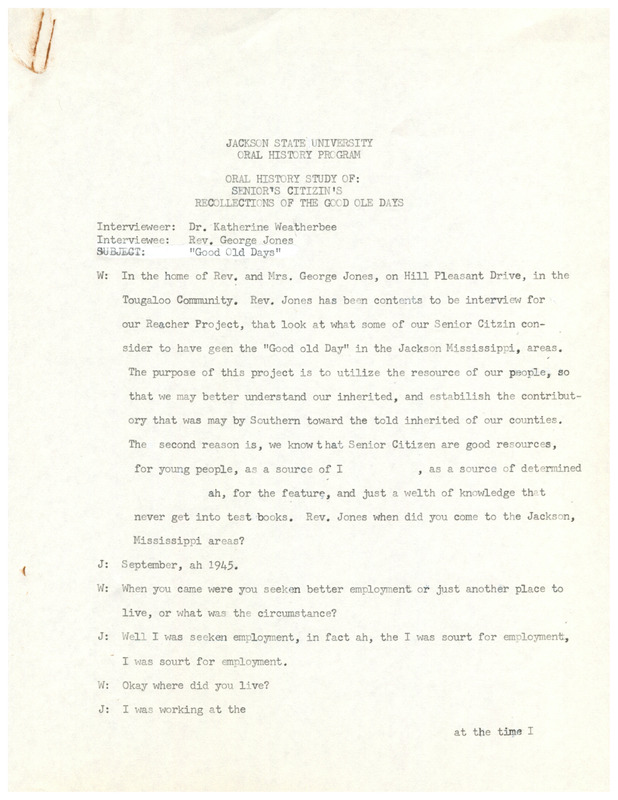 Rev. George Jones moved to the Jackson area in 1945 to work as a college instructor. He discusses his first impressions of Jackson as an educator living on the Tougaloo campus while teaching home economics. He also talks about Sunday school, family, and the positive aspects and culture of the time. The transcript contains handwritten edits.