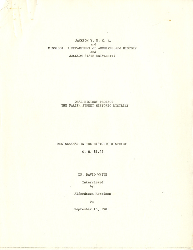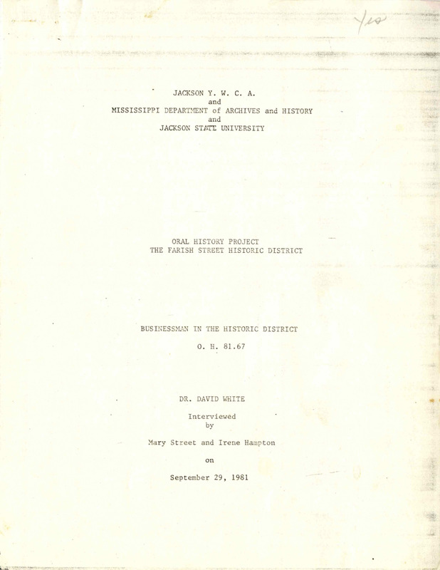 Dr. David White was the first Black optometrist in the state of Mississippi when he moved onto Farish Street in 1951. He talks about Farish Street before and after integration: Black businesses became less prosperous after integration as some Black customers went to white owned businesses. He also talks about his involvement with the NAACP.