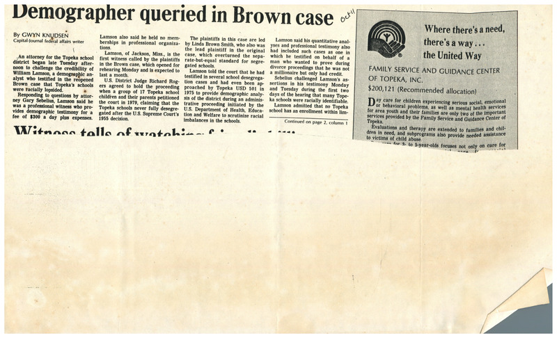 A newspaper article from The Topeka Capital Journal about the cross-examination of expert witness William Lamson by defense attorney Gary Sebelius. Lamson testified about the demographics of Topeka schools and gave analysis on school district boundaries, the placement of portable buildings at schools, and more.