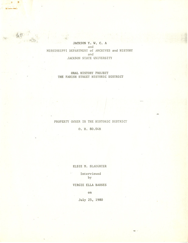 Elsie Slaughter was a years-long homeowner in the Farish Street District. She talks about her parents' background and occupations and her education. She discusses how White people were able to buy large amounts of property in the district by paying delinquent property taxes and how this was a different experience from most Black property owners.