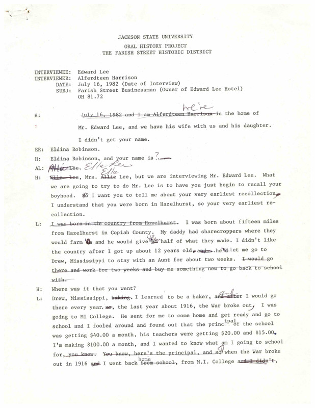 Edward Lee moved to the Farish Street District in 1925 and went on to own several restaurants in the area. He also booked and promoted dances and concerts for clubs and dance halls in the district. Mr. Lee talks about his education, life on a farm, family, and his youth. The transcript is heavily edited with handwritten notes.