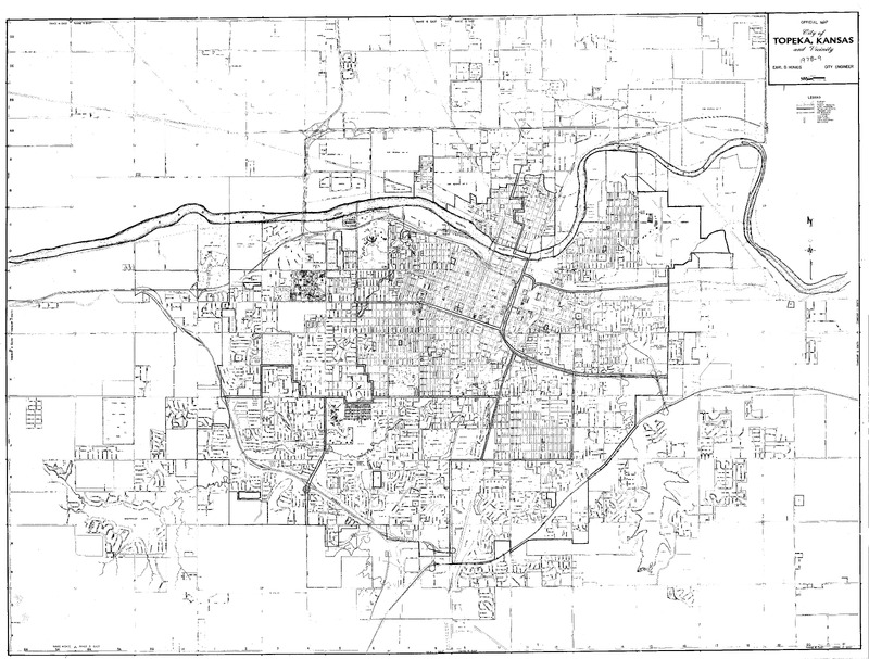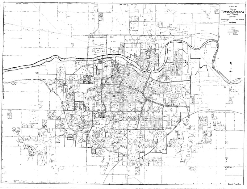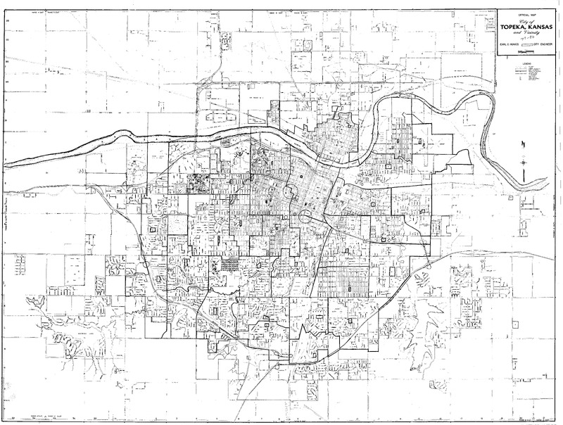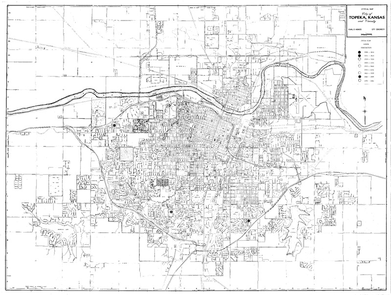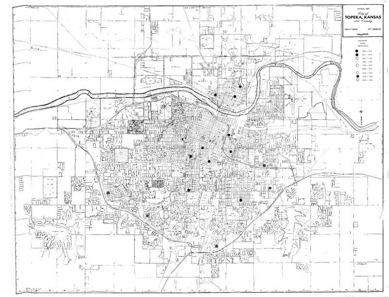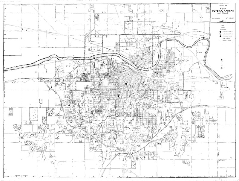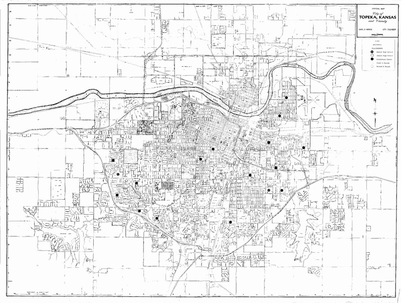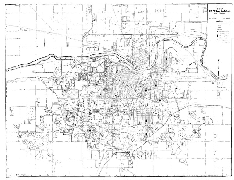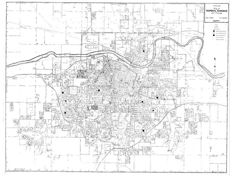 Case Data and Exhibits for Brown III, a relitigation of Brown v. Topeka Board of Education (1954) that corrected resegregation issues caused by open enrollment school choice in 1992. Stickers added to the map by William Lamson to mark senior high school construction in 1931, 1950, and 1961.