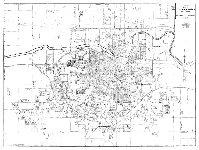 Case Data and Exhibits for Brown III, a relitigation of Brown v. Topeka Board of Education (1954) that corrected resegregation issues caused by open enrollment school choice in 1992. Raw copy of Topeka city map with no additions. Unknown date. Section cut out in the middle-right portion of the map.