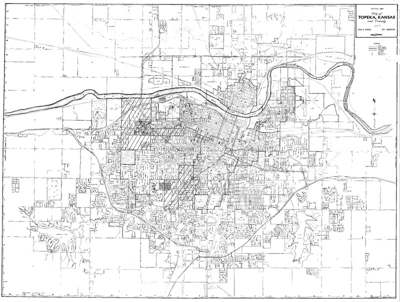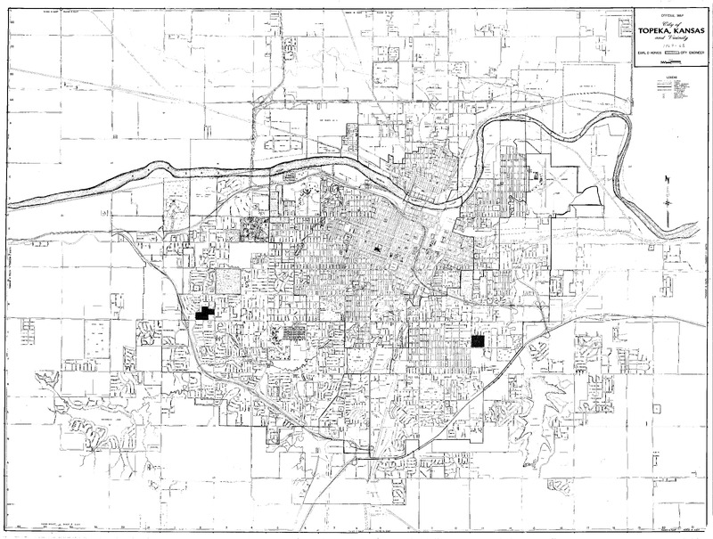 Case Data and Exhibits for Brown III, a relitigation of Brown v. Topeka Board of Education (1954) that corrected resegregation issues caused by open enrollment school choice in 1992. William Lamson handwritten note on top right corner: "1963-1968" with several structures on the map hand marked by Lamson.