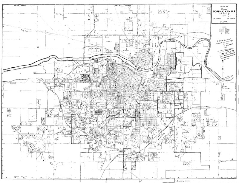Case Data and Exhibits for Brown III, a relitigation of Brown v. Topeka Board of Education (1954) that corrected resegregation issues caused by open enrollment school choice in 1992. The map depicts the city of Topeka from 1958-1959 and William Lamson hand marked each grade school, junior high school, and high school on the map.