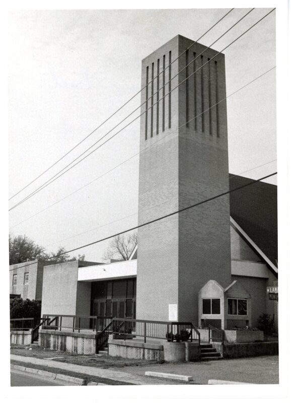 A photograph of Christ Temple Church on Lamar Street in the Farish Street Historic District. The denomination, which has over 160 member churches in the U.S., was founded ca. 1896 in Jackson by the Rev. Charles Price Jones. A historical marker was erected in front of the church in 1992 by Mississippi Department of Archives and History.