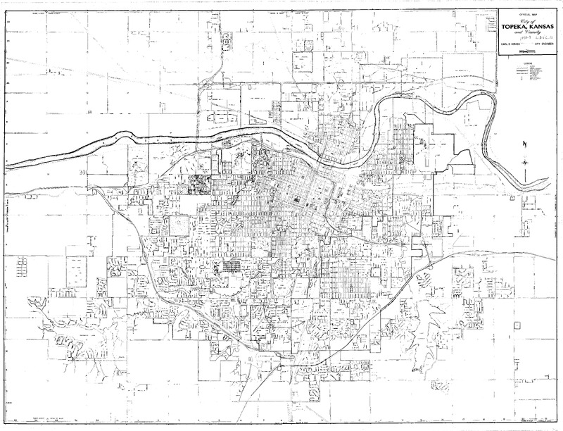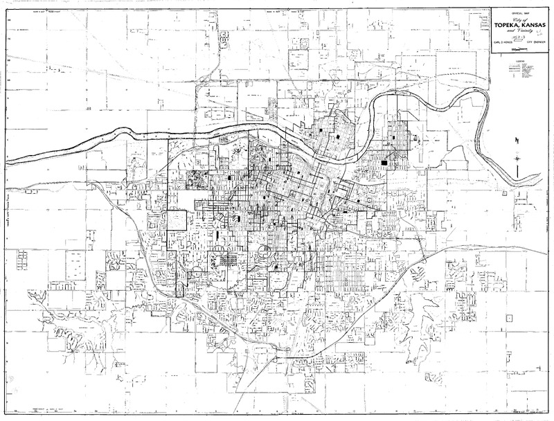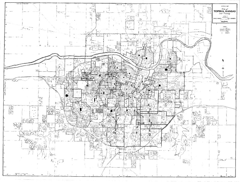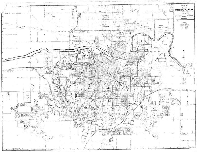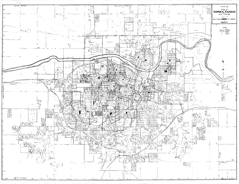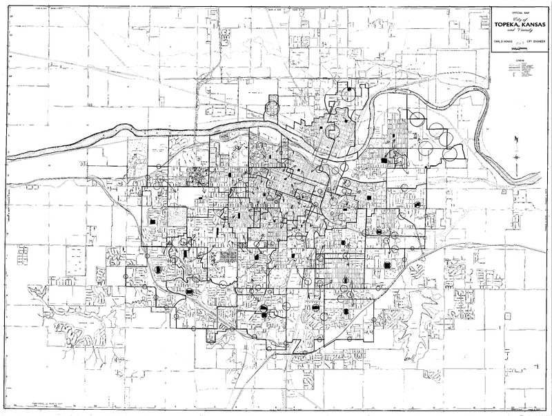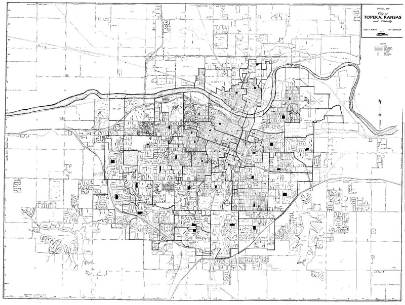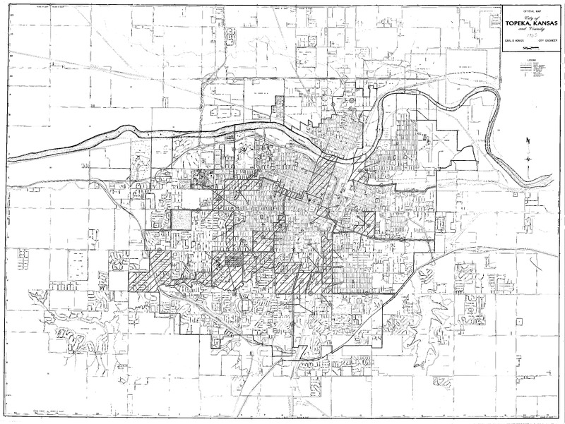 Case Data and Exhibits for Brown III, a relitigation of Brown v. Topeka Board of Education (1954) that corrected resegregation issues caused by open enrollment school choice in 1992. The map depicts the city of Topeka from 1956-1957 and William Lamson hand marked each grade school, junior high school, and high school on the map.