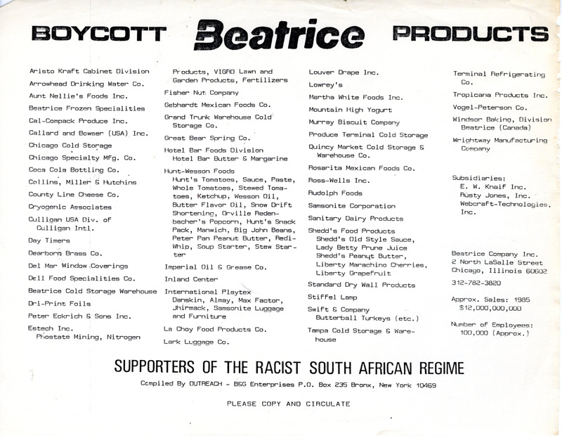 A flier listing the different companies that fall under the ownership of business conglomerate Beatrice. The memo suggests that people boycott these companies because of South Africa’s institutionalized system of racial segregation that lasted from 1948 until the early 1990s, known as apartheid.