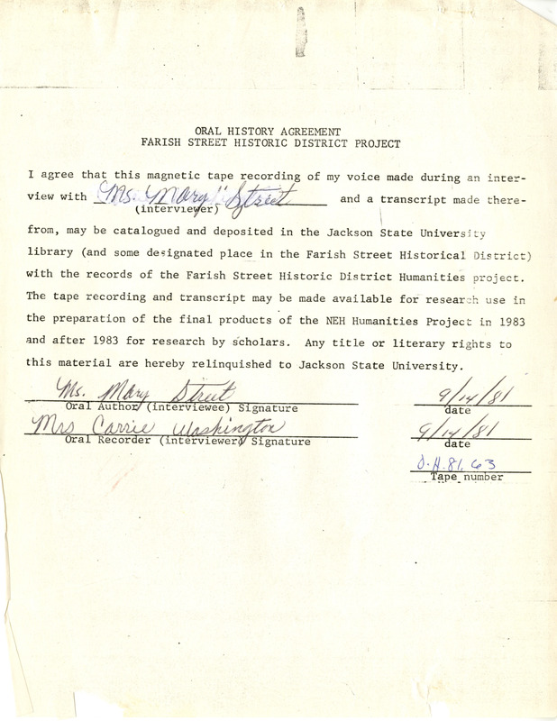 Carrie Washington was born in 1895 and moved to the Farish Street District in 1933 and has lived there since. Ms. Washington talks about her time in the district and her experiences working in the homes of white people. She also talks about businesses and buildings in the district and the Great Mississippi Flood of 1927.