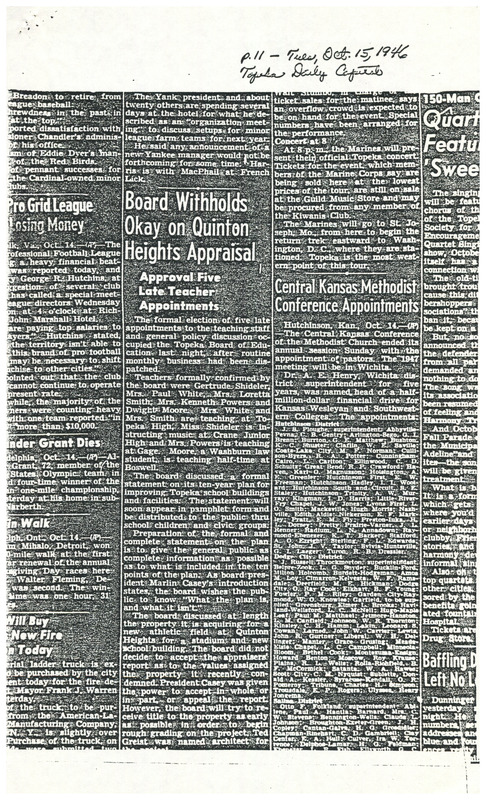 Case Data and Exhibits for Brown III, a relitigation of Brown v. Topeka Board of Education (1954) that corrected resegregation issues caused by open enrollment school choice in 1992. A 1946 newspaper article from the Topeka Daily Capital about the Topeka School Board's discussion of the ten year plan for the school district.