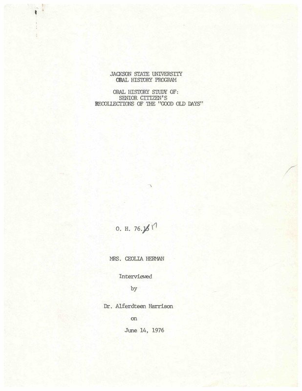 Ceolia Herman was born in McGee, Mississippi, in 1904 and came to Jackson in 1919 to go to high school while living with her sister until getting married and moving to Chicago. She moved back and worked as a nurse and then in a cleaners. She recalls the "Good Old Days" as days when she was younger and didn't have to worry about anything.