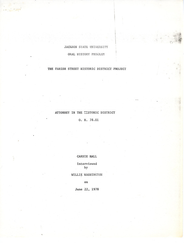 Attorney Carsie Hall moved to Jackson in 1921 to attend Jackson College. He passed the bar exam in 1953 and operated a law firm in the Farish Street District. He talks about a case he worked with the Freedom Marchers during the Civil Rights Movement. He discusses the effect of desegregation on Black businesses and current revitalization efforts.
