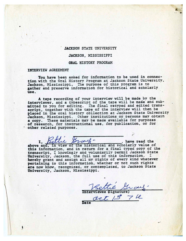 Betty Gray was born in Jackson, Mississippi, in 1903. She remembers the "Good Old Days" as a child growing up in Jackson when school days, games, and family all made for pleasant times. She also talks about her memories of the Farish Street District as well as Emmett Till and Martin Luther King, Jr. The transcript is edited with handwritten notes.