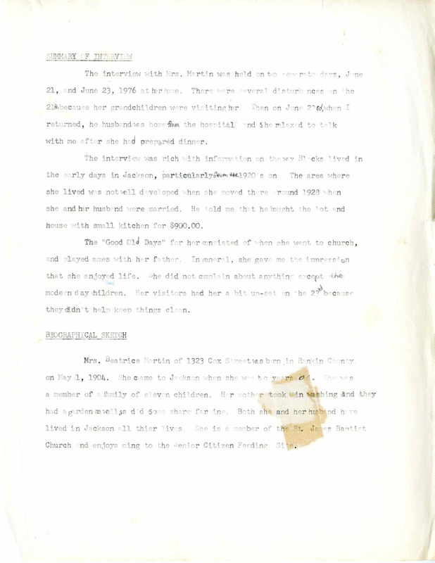 Beatrice Martin was born in Rankin County, Mississippi, in 1904 and moved to Jackson two years later. For her, the "Good Old Days" were when she was younger and went to church and played games with her father. She discusses getting married in 1928 and purchasing some land and a home in a part of Jackson that had not yet been fully developed.