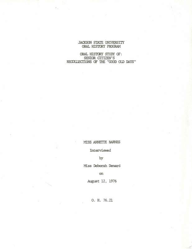 Annette Barnes was born in 1905 in Mount Olive, Mississippi. Her family moved to Jackson in 1909 when her father opened Barnes Drug Store. She talks about her childhood in Jackson being fun but also with responsibilities. She recalls the “Good Old Days'' as the times she can look back on and times were not as hard as they were then thought to be.