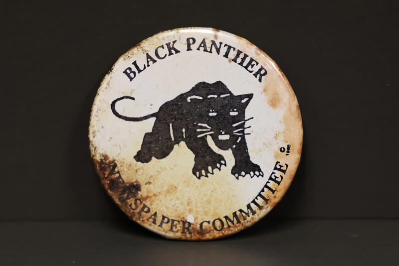 A blue button with the Black Panther logo and text that says “Black Panther.” The Black Panther Party for Self Defense was founded in 1966 by Bobby Seale and Huey P. Newton in Oakland, California. Rooted in Black Power and Marxist-Leninist ideologies, the Black Panther Party would soon spread with branches all over the United States.
