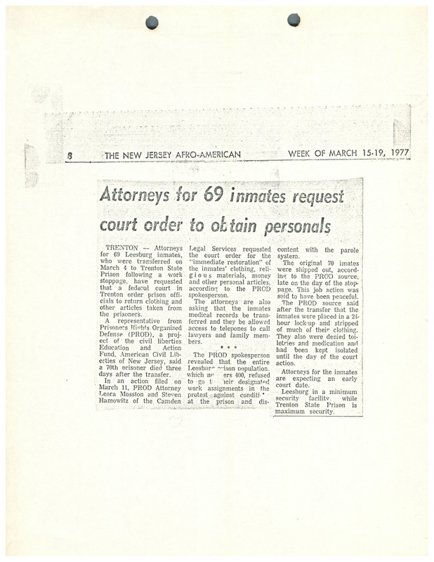 A newspaper article from The New Jersey Afro-American about prisoners who refused work assignments as a protest over living conditions. The prisoners were transferred and denied their personal belongings, telephone calls, and medical care. The group Prisoner’s Rights Organized Defense (PROD) asked a judge to restore everything for the inmates.